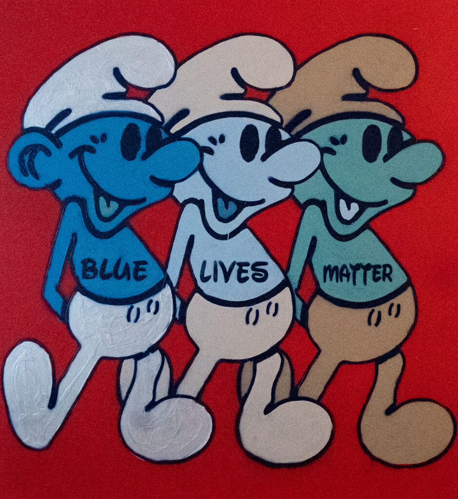 This exhibition brings together two interconnected bodies of work—the Reagan Series and the Smurks Series—that examine how systems of power shape lives long before consent is ever possible. Both bodies of work share the same emotional terrain: one reflects on the era defined by the war on drugs and its lasting impact on Black families and futures; while the other engages the cultural symbolism of policing through the Blue Lives Matter narrative. His provocative work asks viewers to feel, remember, recognize, and arrive at their own conclusions, instead of instructing viewers what to think.